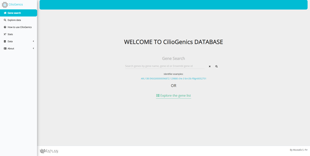 CilioGenics is an integrated and open source, community friendly database for ciliary genes. The key goal is to combine a variety of cilia-related data, including single-cell RNA-seq, comparative genomics, aggregation of gene list from cilia-related publications, protein atlas, proteomics, and cilia-specific motifs. Gene search is quick and user friendly, and it connects to a page devoted to the specific gene, which displays a variety of cilia-related information about that gene.