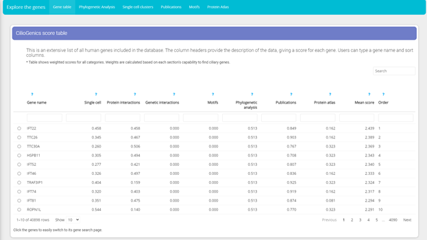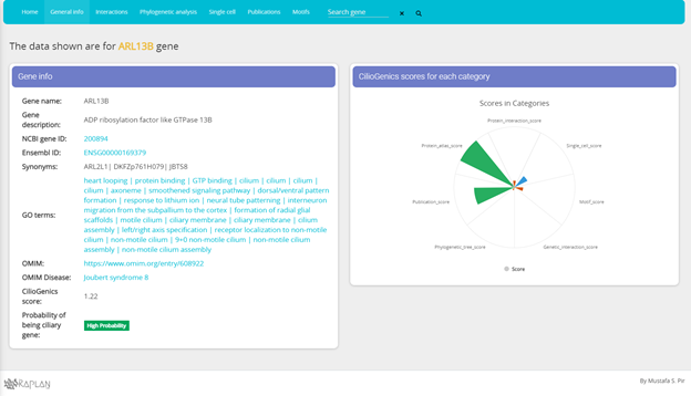 In general info page, you can find various information about the gene, including CilioGenics score for each different categories.